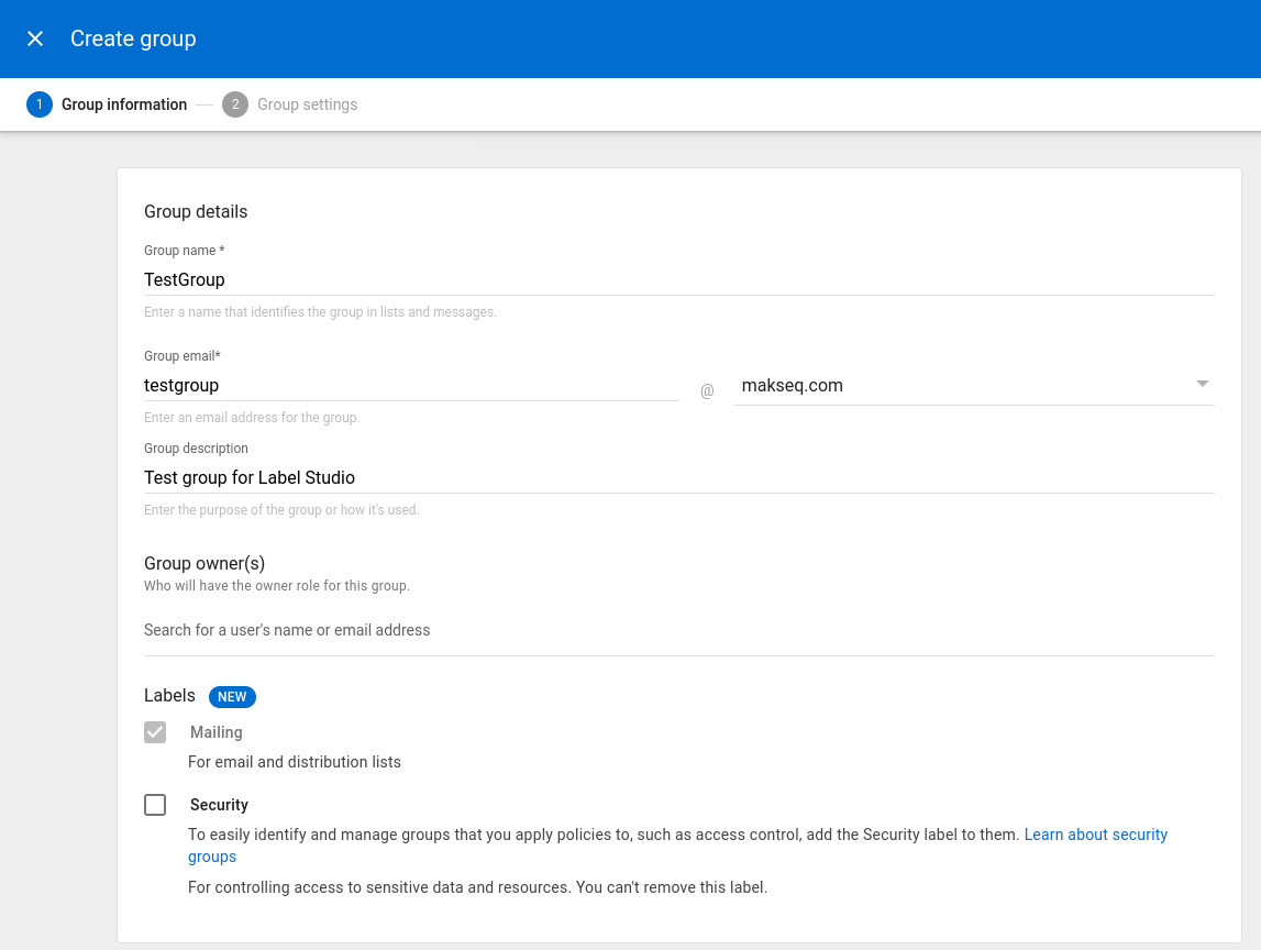 - Click Create group and follow the steps to create and save a new group. In this example, the group is named “TestGroup.”