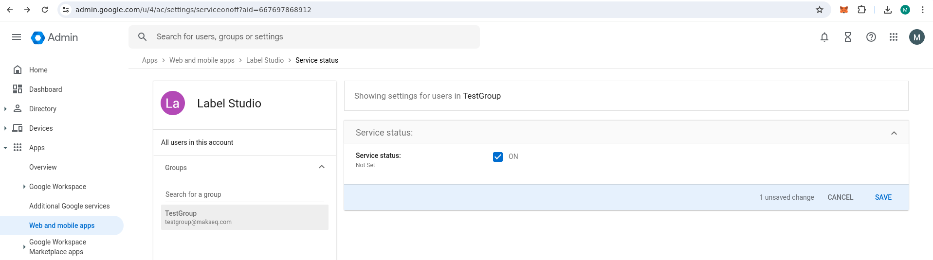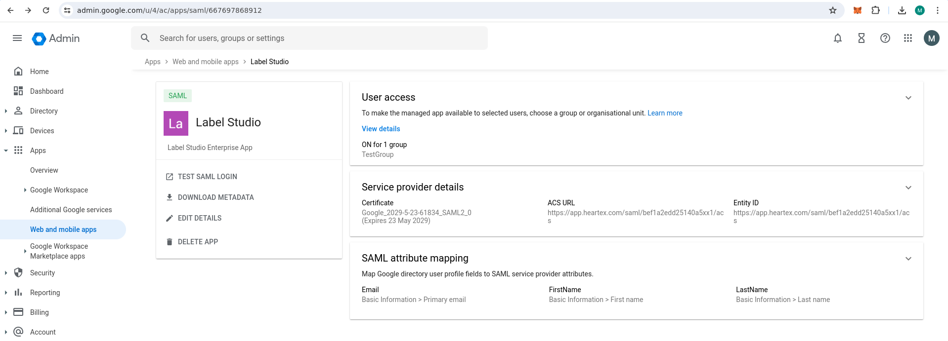 - If you encounter any issues, verify that the SAML attributes and URLs are correctly configured in both Label Studio and Google Admin Console.