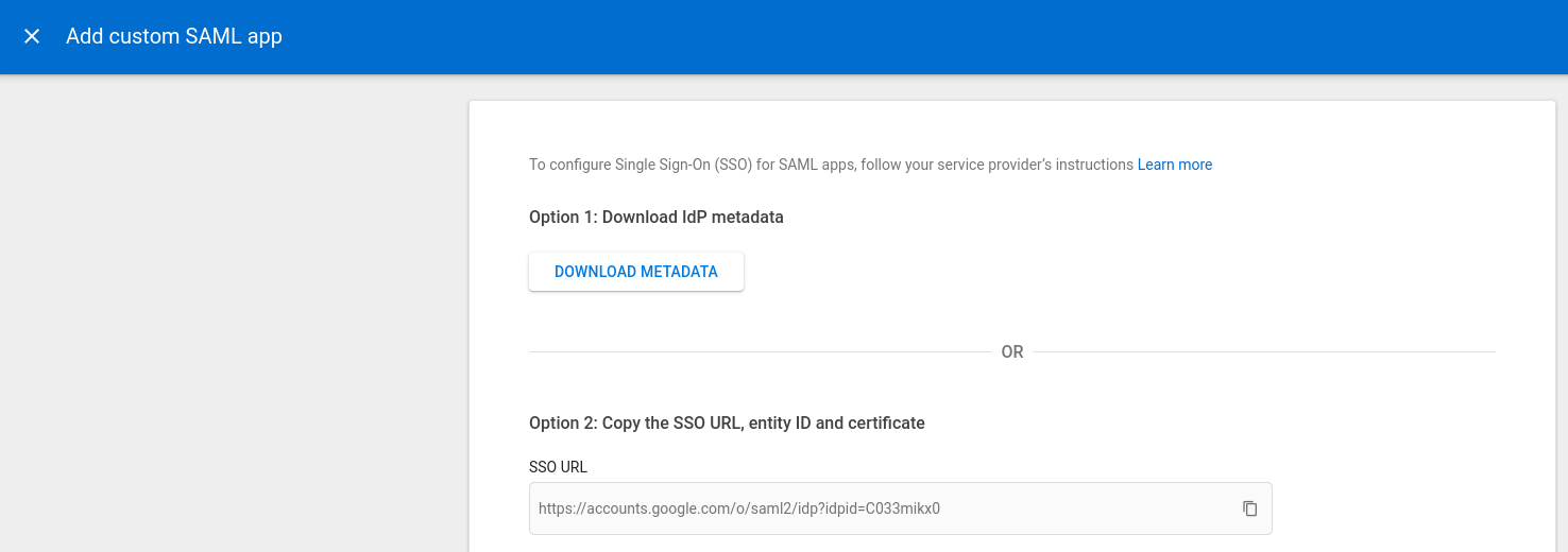 - Upload the IdP metadata file you downloaded from Google Admin console.